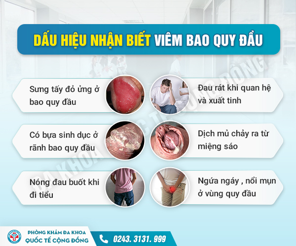 Dấu hiệu: Bao quy đầu tấy đỏ, phù nề; nổi mụn sưng đỏ ở bao quy đầu; có bựa trắng sinh dục ở rãnh bao quy đầu, bao quy đầu lở loét, chảy dịch hôi thối; nổi chấm đỏ ở quy đầu…