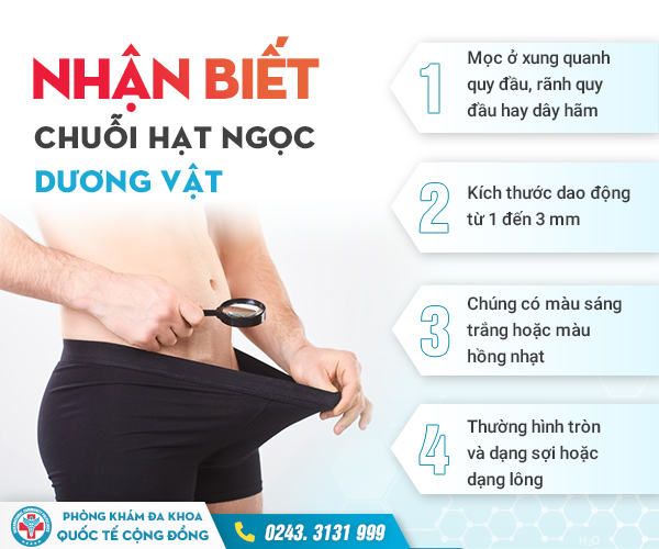 Chuỗi hạt ngọc dương vật là những bóng nước nhỏ li ti xuất hiện ở vành bao quy đầu, thường gây tổn thương nhiều ở hai bên dây hãm. Hạt ngọc mọc không đồng đều, thành từng cụm hay thành hàng. Một số trường hợp khác xuất hiện sưng đỏ nhẹ ở vài chỗ, không đau, không lở loét nhưng lại khiến nam giới dễ nhầm lẫn với bệnh sùi mào gà.
