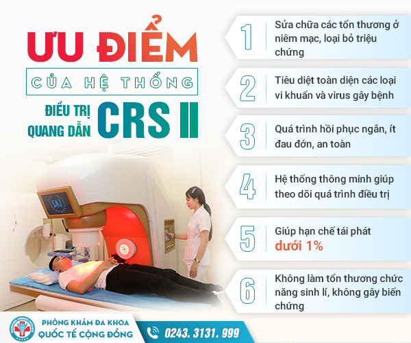 Mọi người nên nhớ, các mẹo khi chữa viêm tiết niệu bằng thuốc chỉ làm dịu triệu chứng tạm thời, không loại bỏ được vi khuẩn tận gốc đặc biệt là trong các ca bệnh dai dẳng, tái phát liên tục. Đó là lý do phương pháp CRS II hiện đang được áp dụng tại Phòng khám Đa khoa Quốc tế Cộng Đồng đã trở thành lựa chọn điều trị hiệu quả được giới chuyên môn khuyên dùng nhờ những ưu điểm khác biệt như: