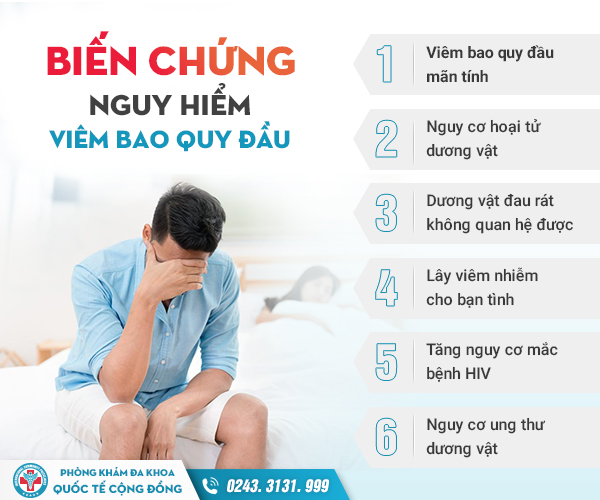Biến chứng: Nếu không được hỗ trợ điều trị hiệu quả kịp thời, viêm nhiễm sẽ “ăn sâu” vào trong dương vật, các ổ viêm loét để lâu dẫn đến hoại tử, thậm chí hình thành các tế bào ung thư dương vật. Bên cạnh đó, viêm bao quy đầu gây đau rát, ngứa ngáy khiến nam giới không thể quan hệ, suy giảm chức năng sinh lý…